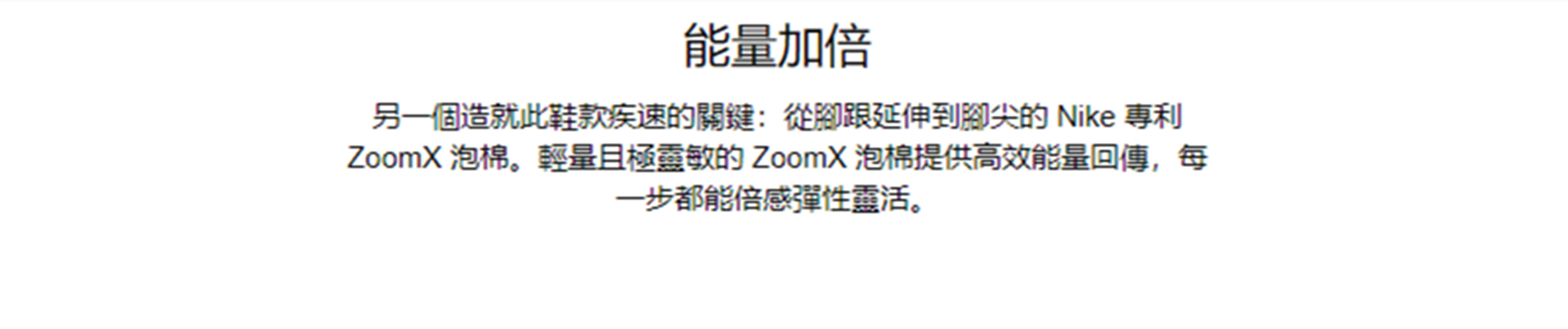 ZoomX 兼具輕盈感、柔軟度和響應力,通過提供優越的能量反饋,助力打造迅疾表現。